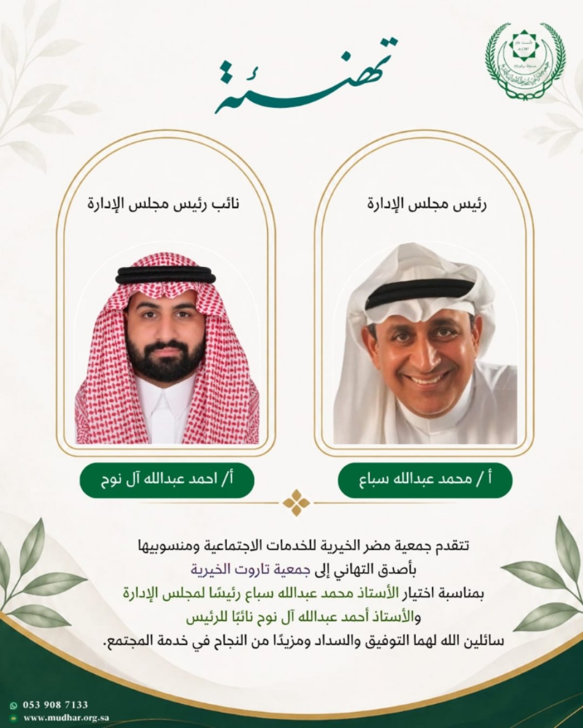 مجلس الادارة بجمعية مضر الخيرية يهنئء مجلس ادارة جمعية تاروت الخيرية لانتخابهم مجلس إدارة للدورة القادمة 2026 حتى 2030